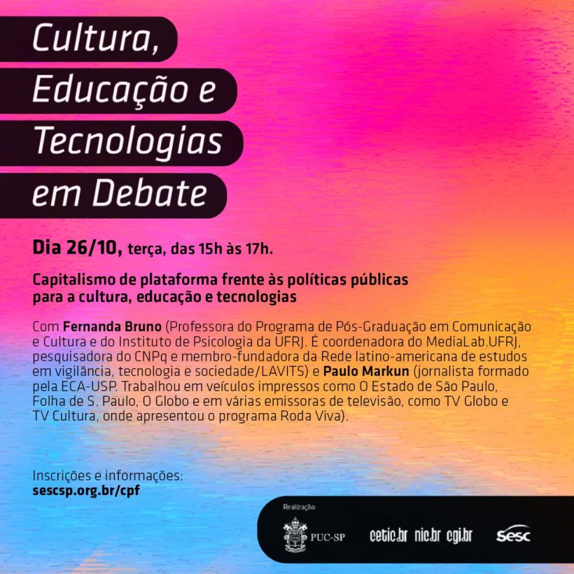Fernanda Bruno participou no dia 26/10 do último encontro da edição do Ciclo Cultura, Educação e Tecnologias em Debate que é uma parceria entre Cetic.br|NIC.br, PUC-SP e Sesc, e tem a coordenação do professor Fernando Almeida. O encontro será sobre “Capitalismo de Plataforma frente às Políticas Públicas para Cultura, Educação e Tecnologias”, conta com a […]