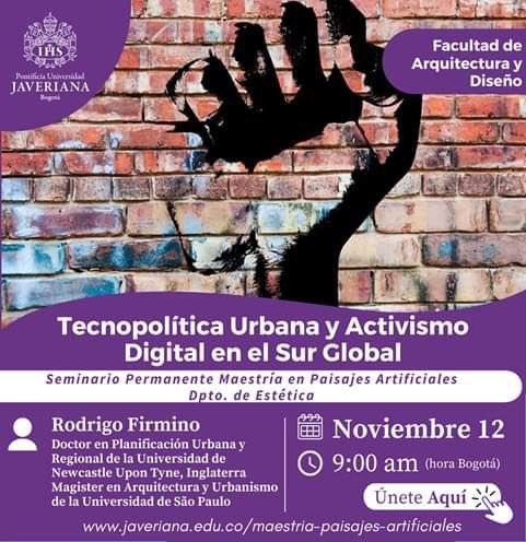 No dia 12.11, Rodrigo Firmino proferiu a a palestra “Tecnopolítica Urbana y Activismo Digital en el Sur Global”, no programa de mestrado Paisajes Artificiales da Pontificia Universidad Javeriana (Colômbia). Firmino apresentou a recente pesquisa sobre a redefinição de fluxos urbanos e infraestruturas por meio do engajamento com movimentos de ativismo digital periférico. A partir do […]