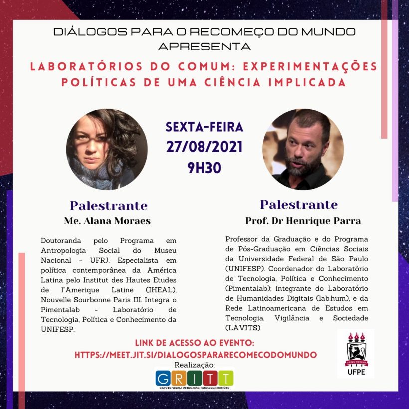 Na próxima sexta-feira (27/08), às 9h30, Alana Moraes e Henrique Parra participam de encontro promovido pelo Grupo de Pesquisa em Inovação Tecnologia e Território (GRITT/UFPE) promovendo um diálogo sobre o artigo “Laboratórios do Comum: Experimentações Políticas de uma Ciência Implicada”. Diante dos desgastes das formas políticas apresentadas pelos sucessivos modelos de governança, Moraes e Parra […]