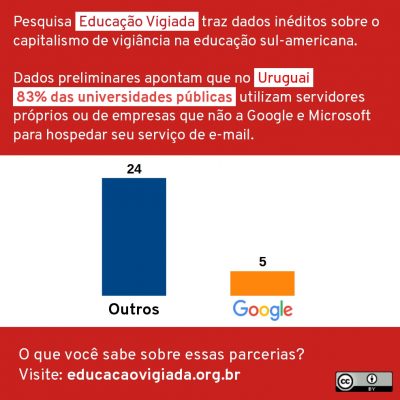 Já no Uruguai, os dados apontam em outra direção: a predominância de alternativas aos servidores das empresas Google e Microsoft. Do total de 29 universidades públicas uruguaias pesquisadas, 83% utilizam servidores próprios ou de outras empresas para hospedar seus serviços de e-mail, e somente 17% (5, no total) utilizam servidores da Google.