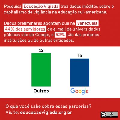 Na Venezuela, dentre as 23 universidades públicas pesquisadas, 10 (44%) hospedam seu serviço de e-mail em servidores da Google e 12 (52%) hospedam em servidores próprios ou de outras empresas (os dados de 1 universidade ainda precisam ser investigados com maior detalhamento).