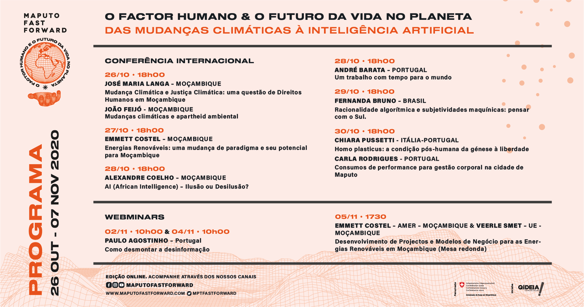 Dos dias 26 a 30 de Outubro deste ano, acontece a Maputo Fast Forward 20, em edição totalmente online, com a temática “O Factor Humano e o Futuro da Vida no Planeta: das mudanças climáticas à inteligência artificial”. A pesquisadora da Lavits Fernanda Bruno celebrará painel “Racionalidade Algorítmica e subjetividades maquínicas: pensar com o Sul” dia 29 de Outubro às 18 horas.