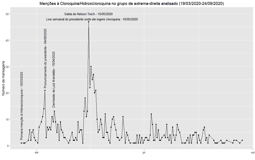 De 19 de março a 24 de setembro de 2020, 867 mensagens de texto de 429 usuários diferentes mencionaram a cloroquina ao menos uma vez (vide gráfico 1 abaixo).